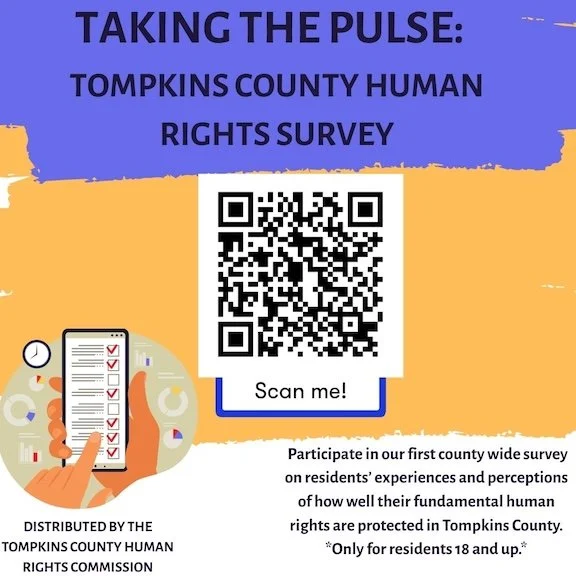The Tompkins County Human Rights Commission is conducting our first county wide survey on residents’ experiences and perceptions on how well their fundamental human rights are protected in Tompkins County (only for those 18 and up). What are the Human Rights you value most? Have you suffered discrimination or been deprived of basic human rights? We want to know! Take our county-wide survey here or scan the QR code below!